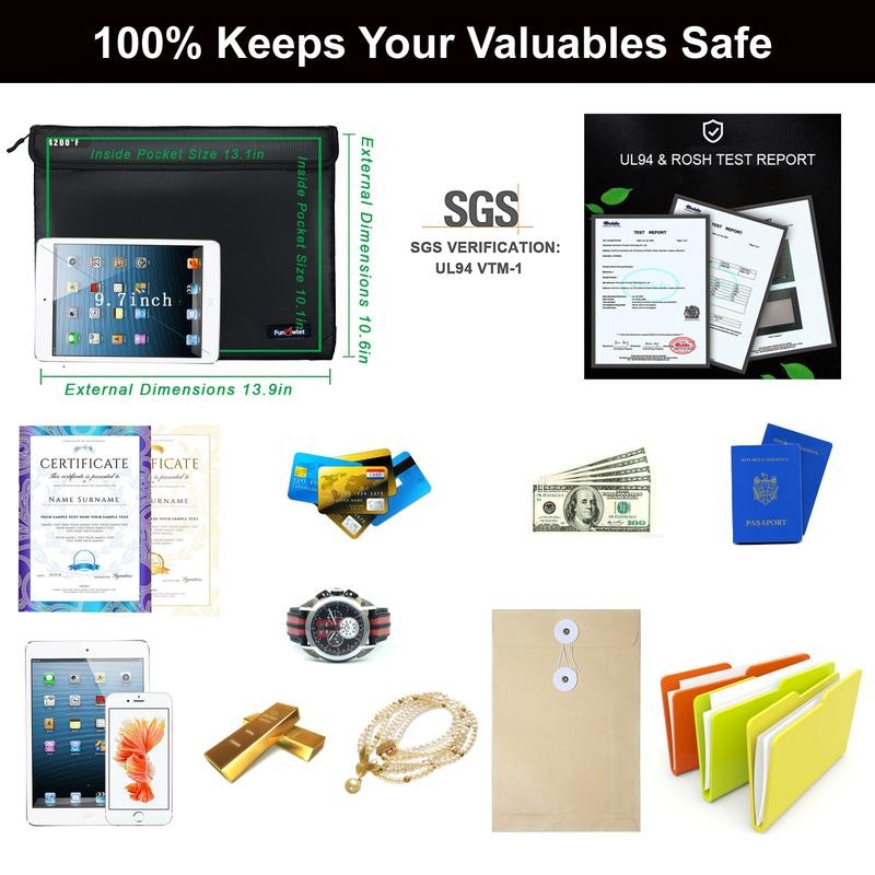 - WELL MADE MULTI-PURPOSE FIRE BAGS: The fireproof bag has two size 13.9"x10.6" and 11"x7.7" ,you can choose different sizes according to your own needs. Large capacity & widely used, they can store all valuables include bank deposit, important legal documents,cash,coin,credit cards,letters,precious photos,marriage certificate,passport, jewelry, tablet and so on.