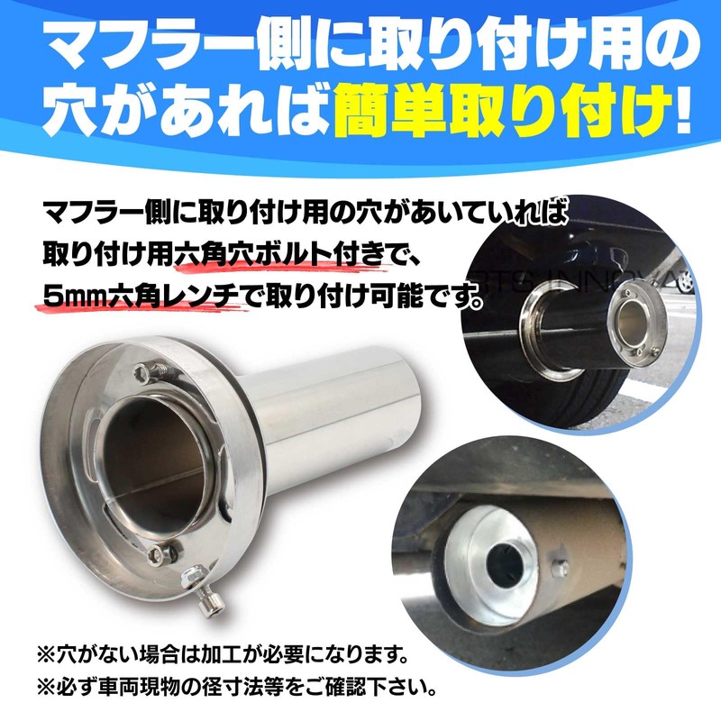 - Easy Installation: If there is a hole on the muffler side (*drilling is required if there is no mounting holes), it comes with a hex hole for mounting and can be mounted with a 0.2 inch (5 mm) hex wrench. Hex wrench is not included, so please prepare it separately. The inner lid can be adjusted to mute the sound exhaust to improve torque. If there is no holes, processing is required