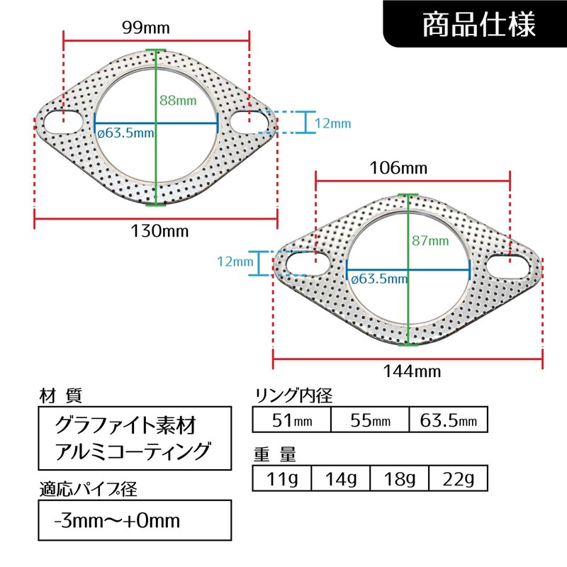 - Product Specifications: Set of 4 (Size) Ring inner diameter: 2.0 inches (51 mm), 2.2 inches (55 mm), 2.5 inches (63.5 mm). Thickness: 0.08 inch (2 mm); Compatible Pipe Diameter: 0.1 inch (3 mm) to +0.0 inch (0 mm); Bolt Width: 0.5 inch (12 mm); Hole Pitch: See images; Material: Graphite laminate; Weight: 0.4 / 0.7 / 0.8 oz (11 / 14 / 18 / 222 g)