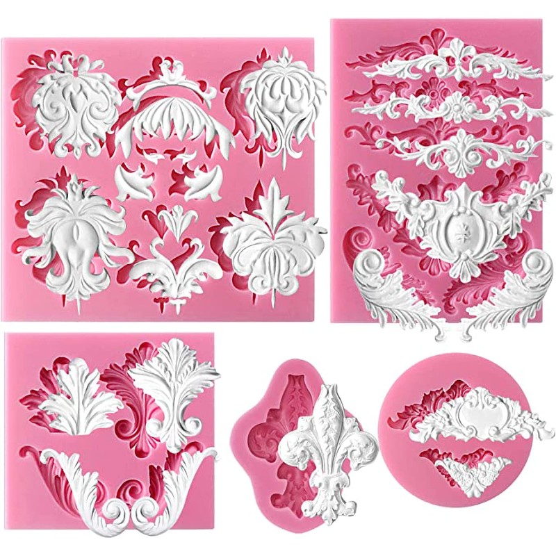 Funshowcase Molde de silicona para fondant de encaje de estilo barroco para manualidades, decoración de bordes de pasteles, decoración de cupcakes, joyas, arcilla polimérica, acento de velas, proyectos de manualidades, juego de 5 pulgadas