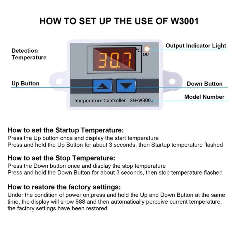 Specification: Digital temperature controller Model: XH-W3001 Output Type: Direct Output Output capacity:10A max Power Supply: DC12V,DC 24V,AC 220V Load power:120/240/1500W Temperature Measurement Range:-50 C110 C Temperature Control Range:-50 C110C Temperature Control Precision:0.1C Input measurement:NTC10K waterproof probe L=1meter waterproof How to set 1. Press up button show the starting temperature. 2. Long press UP button the temperature display Flashing , Press the UP or Down button. 3. Set the start temperature value. 4. Press Down button show the Stop temperature. 5. Long press Down button the temperature display Flashing , press the UP or Down. 6. Button Set the stop temperature value Package Included: 1pcs Digital temperature controller