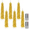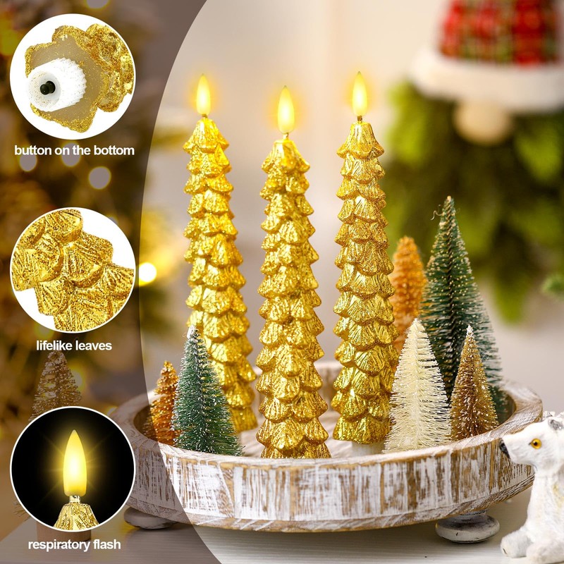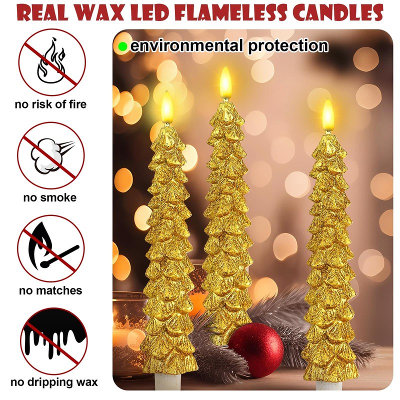 Funtery 6 Pcs LED Christmas Tree Flameless Taper Candles, 9.7 Inch Real Wax Battery Operated Candlestick Lights with 3D Flame and Remote Timer for Windows Fireplace(Gold,Christmas Tree)
