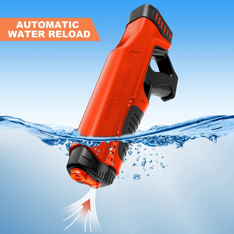 - 【Automatic Continuous Water Filling】Dip the front of toy gun into a water source, motorized water gun will automatically suction and fully water reload in 15 seconds.