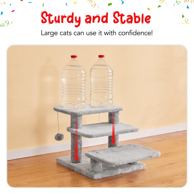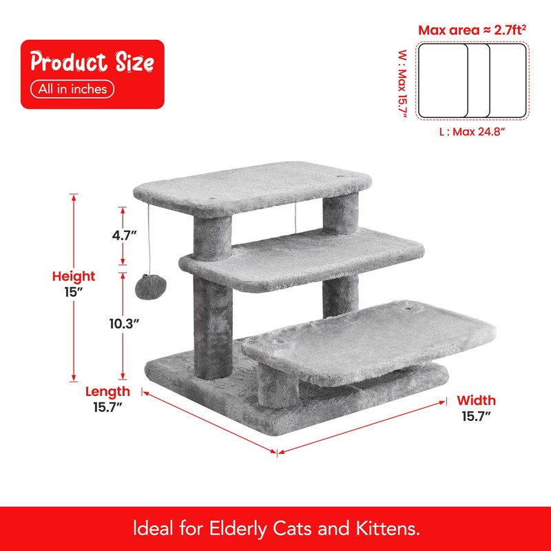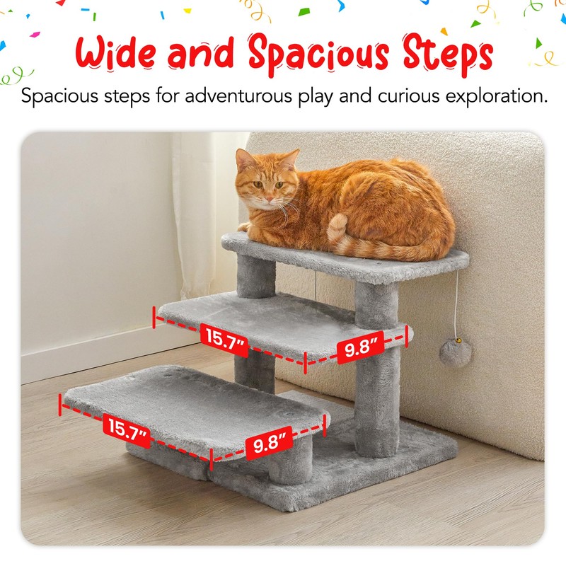 Furcato 15''H Multi-Step Pet Stairs for High Beds & Sofas, 3-Step Cat Stairs with 2 Toy Balls, Wide Boards for Indoor Kittens Dogs Pets Climbing, Light Grey