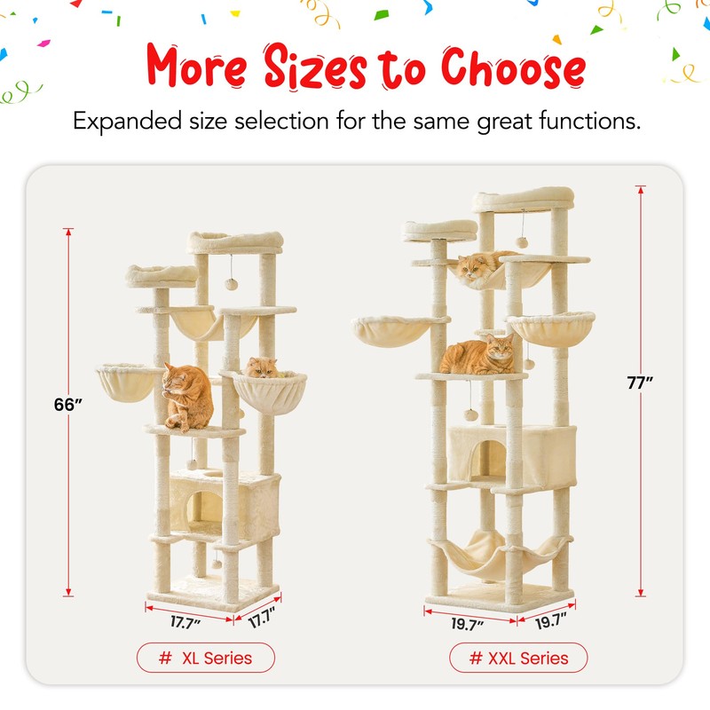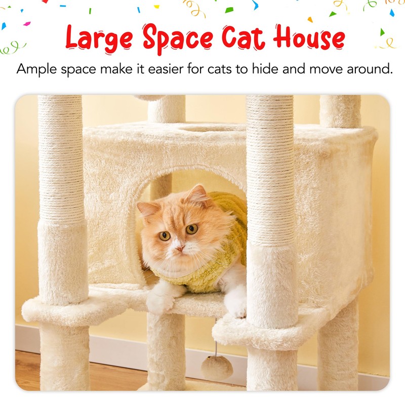 - Comfort and Entertainment: Our 66 inches tall cat tree offers a combination of amusement and practicality. It features two cushioned perches, a spacious cat condo, scratching posts, and interactive toys