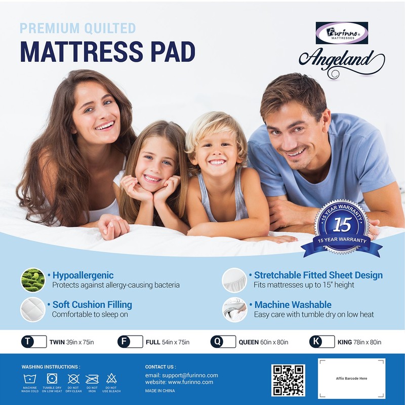 Furinno Angeland Quilted Mattress Pad creates a cleaner and more comfortable sleeping environment for you and your family. The plush filling of microfiber polyester makes your mattress feel softer and provides support to your body at the same time. High thread count of microfiber polyester fabric is hypoallergenic, protecting your mattress against allergy-causing bacteria. The new technology of microfiber polyester fabric is soft, durable, lightweight and breathable. An elastic band is used on the side skirt to make the protector fit to mattress height up to 15 inches. It is recommended to machine wash the protector with regular laundry detergent without bleach. Tumble dry on low heat and do not iron.