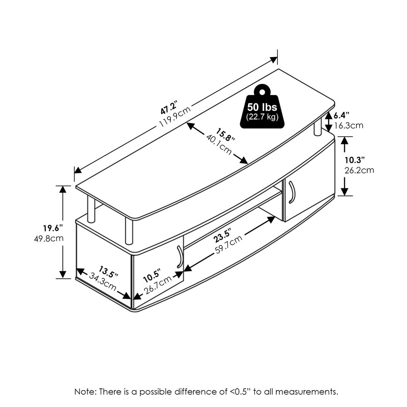- Accommodates a 55-inch TV with a top surface weight capacity of 50 lbs, ensuring stability and support.