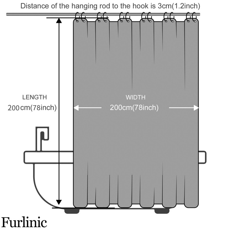- Size: 200 cm x 200 cm (W x H). Package contents: 1x shower curtain and 12x white shower curtain hooks.