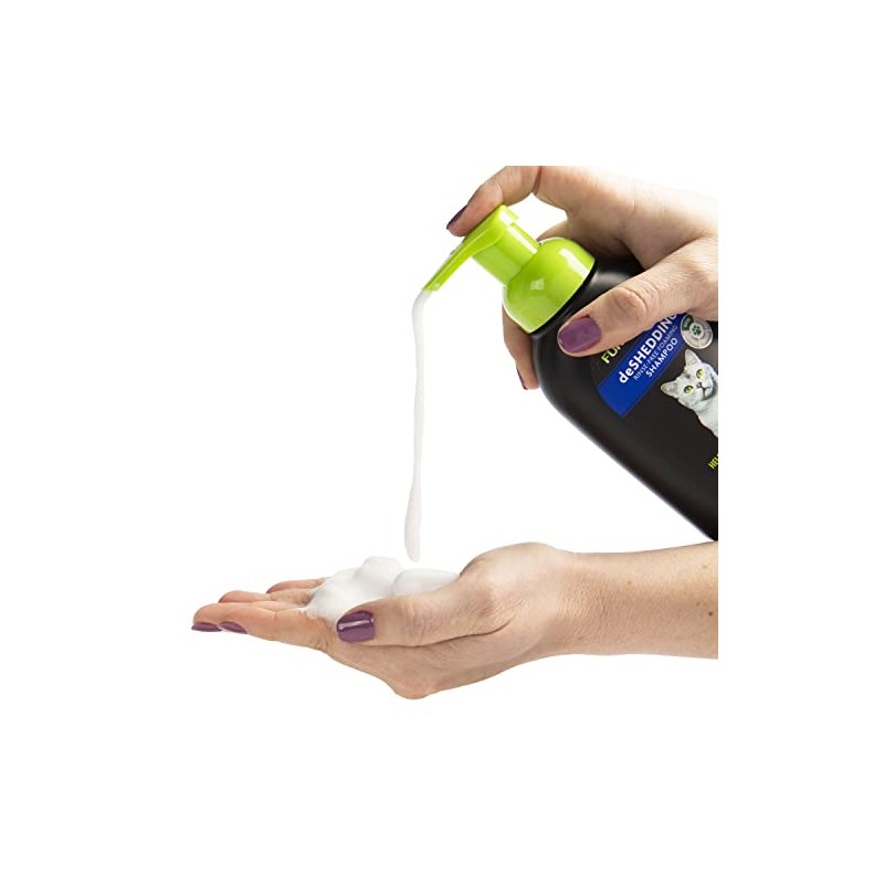 - No se requiere enjuague, simplemente masajee el champú en la capa de su gato.
