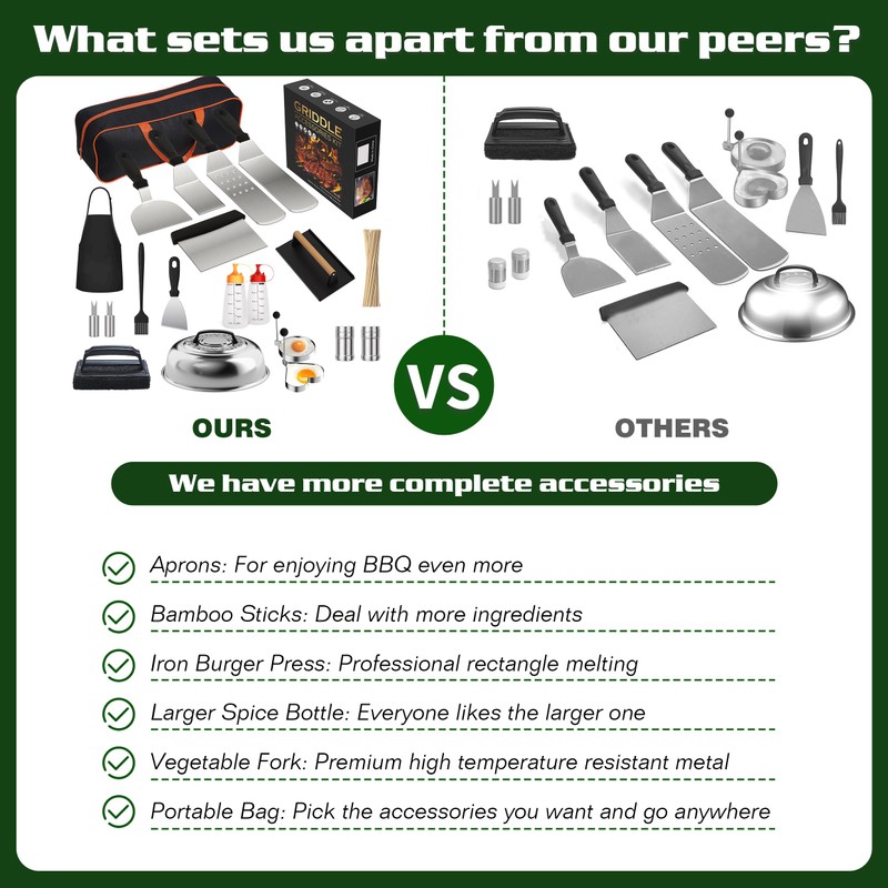 • PROFESSIONAL GRIDDLE TOOLSThis set of grill tools with grill scraper, spatula and grease bottle will help you grill as easily as a restaurant chef even if you are a beginner griller. It will make everyone happy at your BBQ, weeknight party or everyday meal!