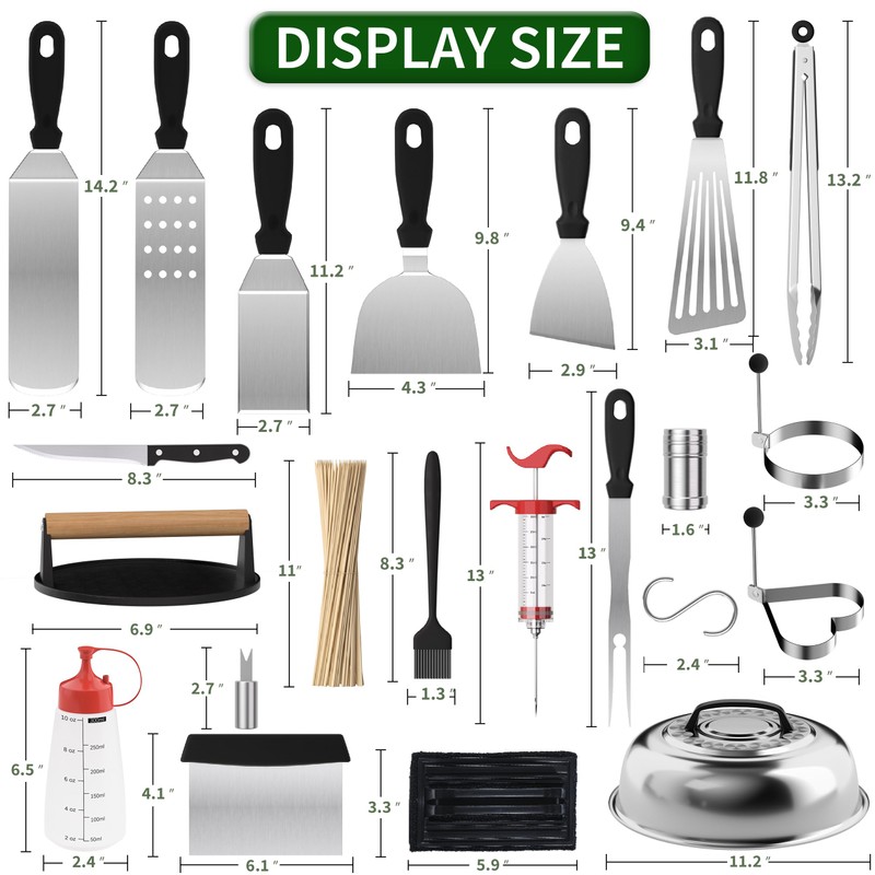 - Furnhome 134 pcs practical griddle accessories kit includes Long griddle spatula, Short griddle spatula, Slotted spatula, Slant Edge Scraperbasting coverGrill TurnerBurger Press, exclusive apron,silicone glove,meat injector,fish turner, meat knife,Griddle Chopper,Grill Tongs,Grill Fork,Basting Brush, 2 Squeeze Bottle, 2 Egg Rings, 2 Spice Shakers,2 corn fork,8 Hanging Hooks,100pcs bamboo skewers,Cleaning Brush,high-quality storage bag and a beautiful package box.