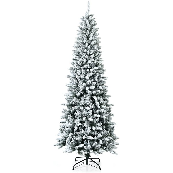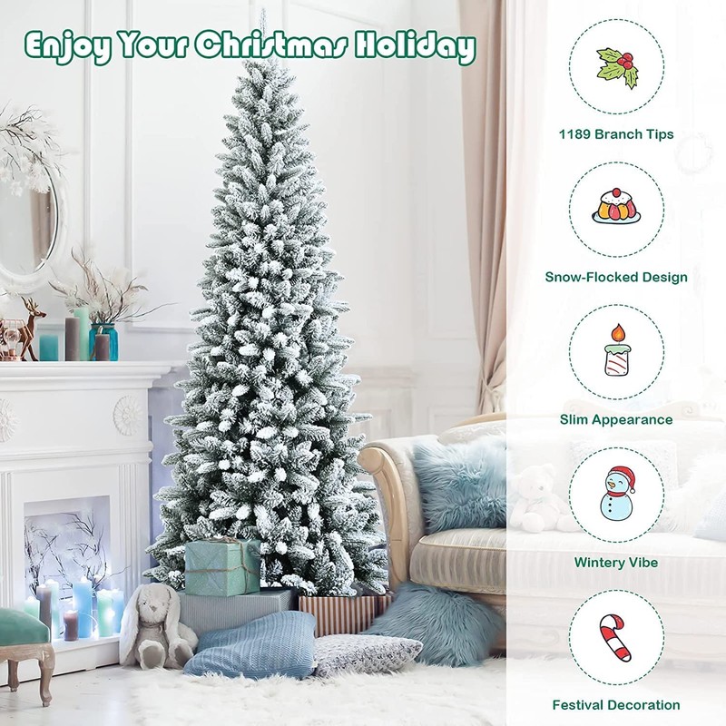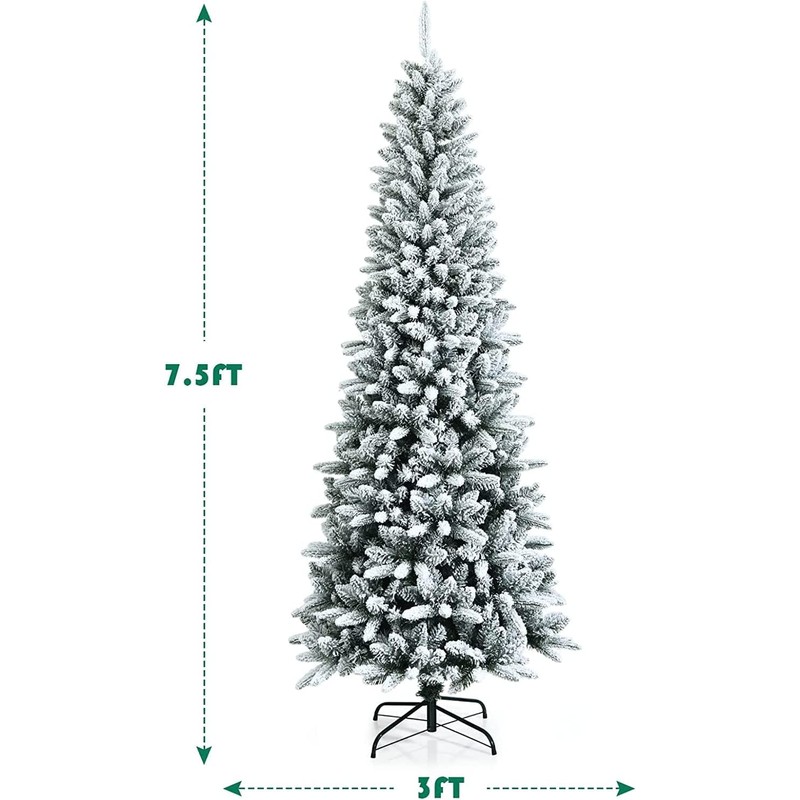 • Slim Snow-flocked Christmas Tree: Crafted with 1189 branch tips, this 7.5 ft artificial Christmas tree is leafy and elegant in layered snow flocked design, adding a unique wintry feel to any setting. With its slim pencil design, this Xmas tree is space-saving and perfect for display in corners or rooms with limited space.