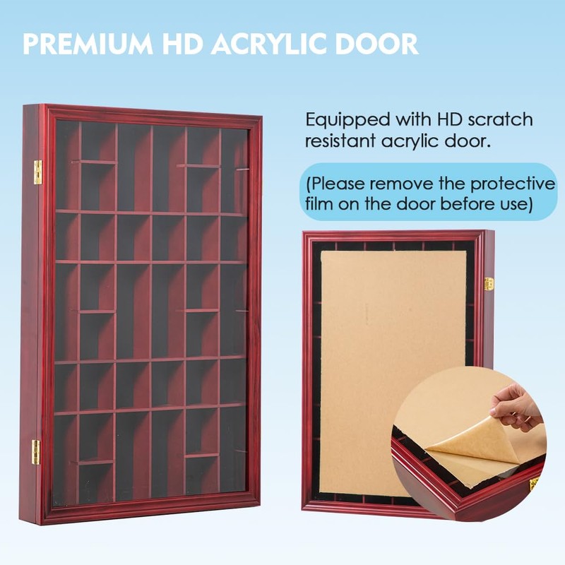 - 【Lockable Acrylic Door】 The display frame door is constructed from HD acrylic material, designed not only to enhance the display but also to provide 98% UV protection, shielding your collections from rays and preventing fading. (TIPS: Please remove the protective film on the door before use.)It also features a secure locking latch, providing peace of mind and safeguarding your valuable collection