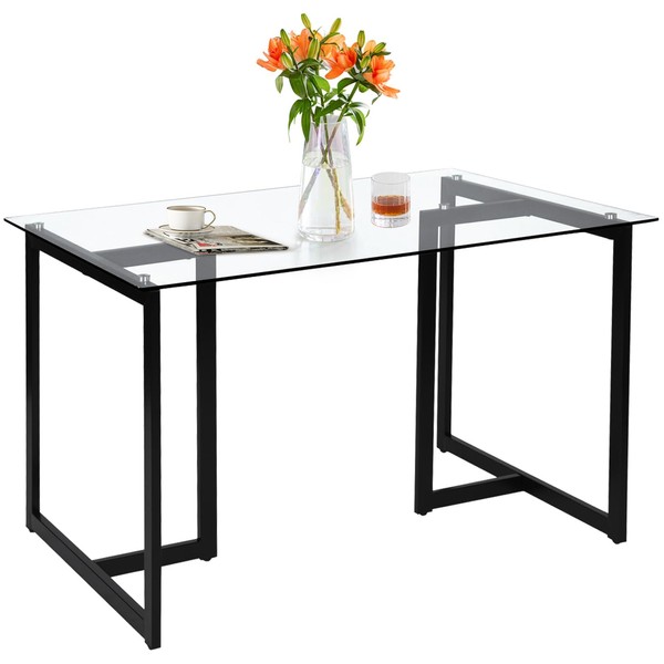 FurnitureR Glass Dining Table 55.1 Inch, Modern Elegant Rectangular Multipurpose Table with Sturdy Metal Frame for Dining Room Kitchen, Black