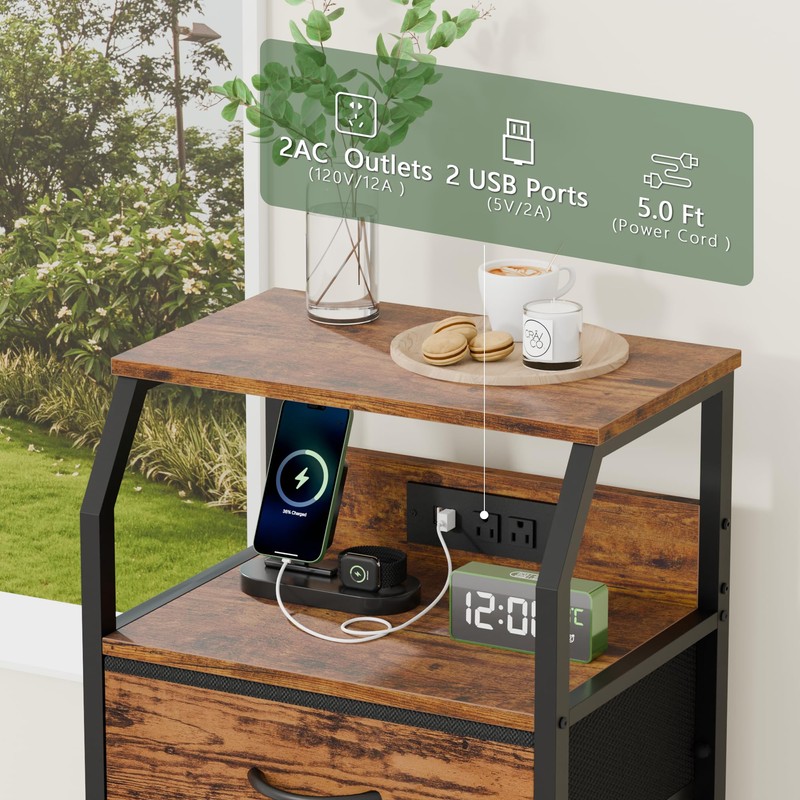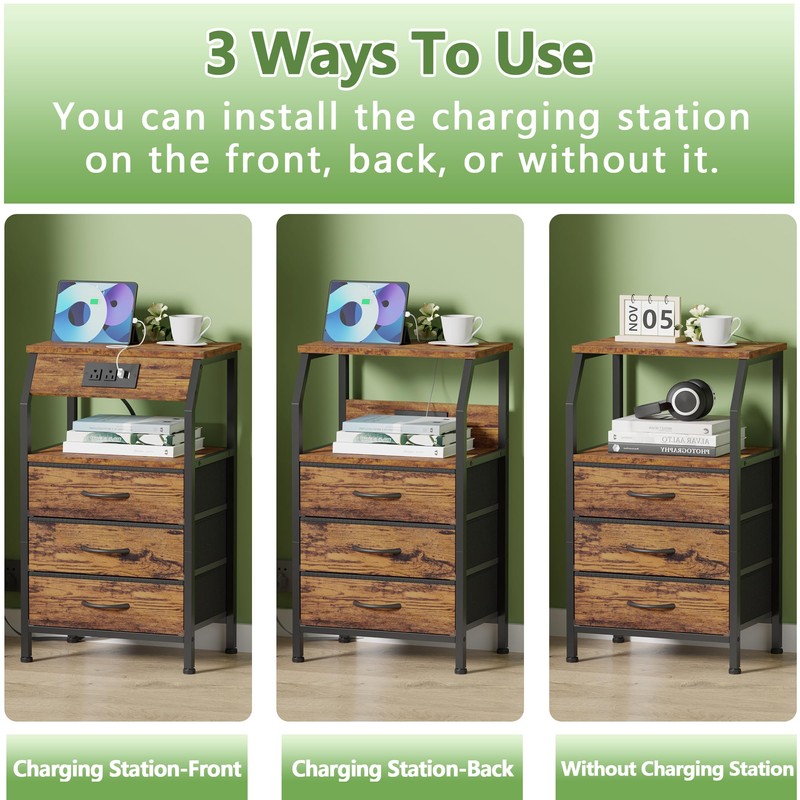 Furnulem Night Stand with Charging Station, USB Ports and Outlets, 28.3 Inch Tall Bedside Table with Wood Shelf, 3 Fabric Drawers Side Table for Bedroom, 3 Ways to Use, Rustic Brown