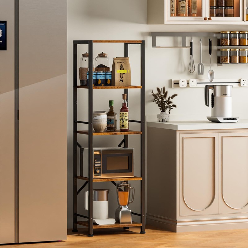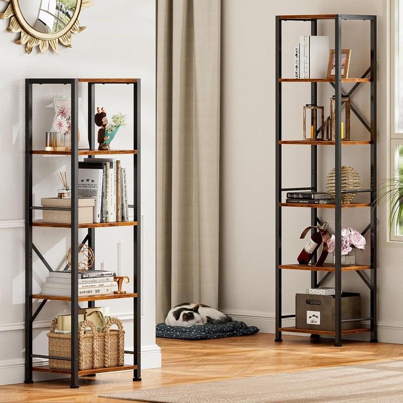 Furologee 5 Tier Tall Bookshelf, Rustic Narrow Bookcase, Display Standing Shelf Units, Metal and Wood Storage Shelves Organizer for Bedroom, Living Room, Home Office, Entryway, Kitchen, Rustic Brown