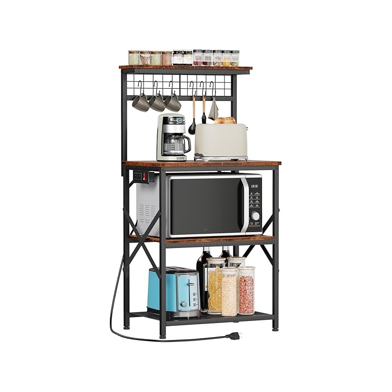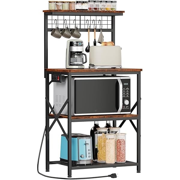 Furologee Kitchen Bakers Rack with Power Outlet, Microwave Oven Stand with Storage 4 Tiers, Coffee Bar Table with 6 S Hooks, Kitchen Storage Shelf Rack for Spices, Pots, Rustic Brown
