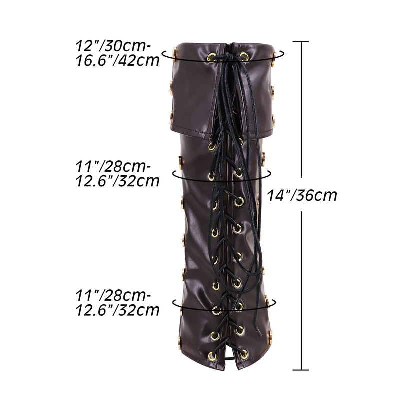• Size: This pirate boot tops men has only one size, but can adjust the ties to fits almost men. Its top circumference is about 12"-16", midle circumference is about 11"-12.6" and the bottom circumference is about 11"-12.6"