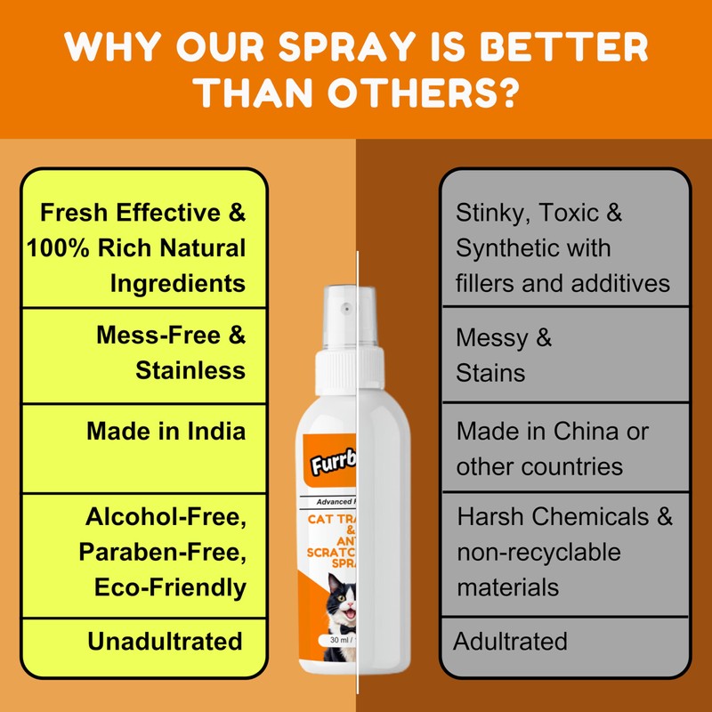 - ADVANCE & SAFE FORMULA FOR EFFICIENT TRAINING: Furrbites Advanced Cat Training & Anti-Scratch-Bite Spray formula is specially designed to stop destructive behaviour by cats throughout your home with just simple spray on problem areas. This alcohol-free blend uses biodegradable botanical ingredients that are safe for pets and won’t leave any water stains after application.