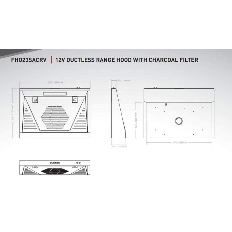 • Easy Installation: Mounting hardware and screws are included with a clearly instructed user manual. The product dimensions are (W x H x D) 23.50 Inches x 4.75 Inches x 17.75 Inches. The Furrion Range Hood is backed by Furrion's 12-month warranty.