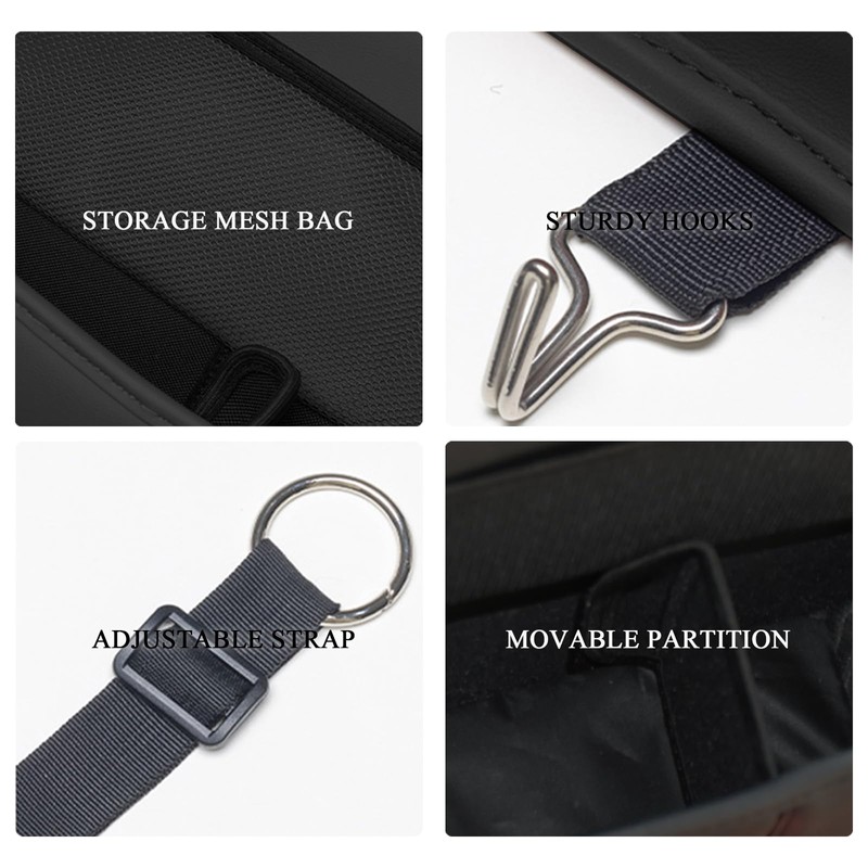 - 【 Multi Functional and Portable 】 The car organizers adopts a circular loop buckle design, which is easy to operate and convenient to hang. It can store tissues, chargers, water bottles, bank cards, snacks, tablets, mobile phones, and other items. The hook design at the bottom of the organizer can also hang umbrellas, garbage bags, and other items, making it easy to store
