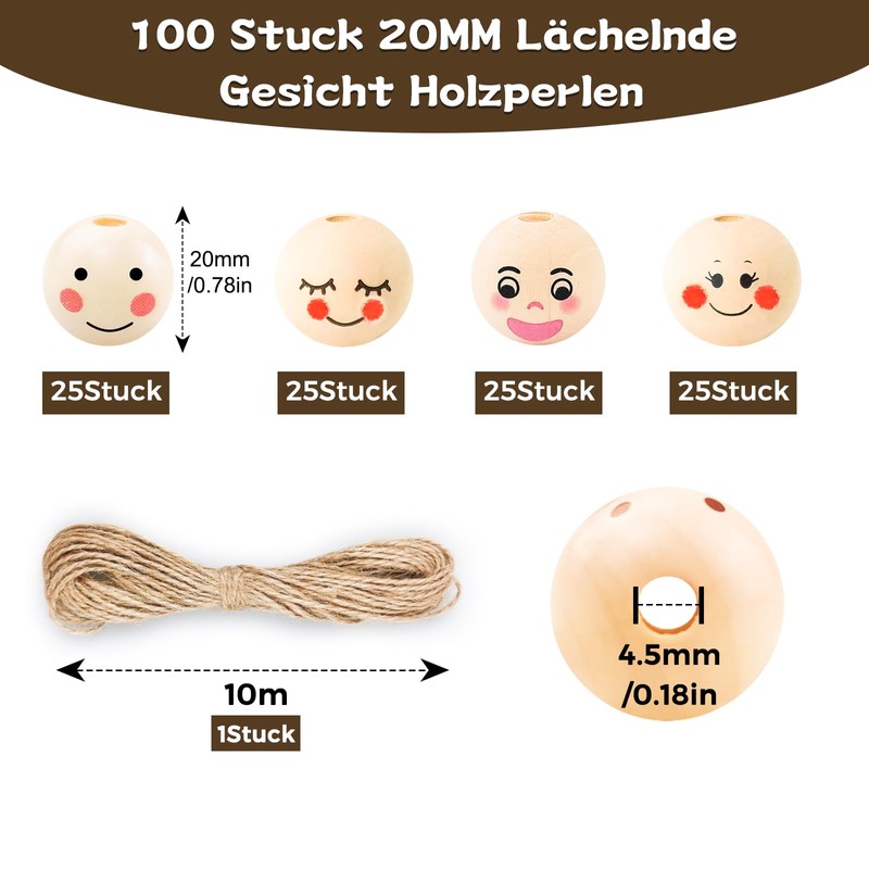 - Pack of 100 20 mm wooden balls with face: the wooden balls with hole measure 20 mm with 4.5 mm holes, there are 100 pieces, 4 styles, 25 pieces of each style, so you can use the included jute cord to thread through the holes to make the craft you want, wooden beads with face will be used for festive decorations and other decorative items.