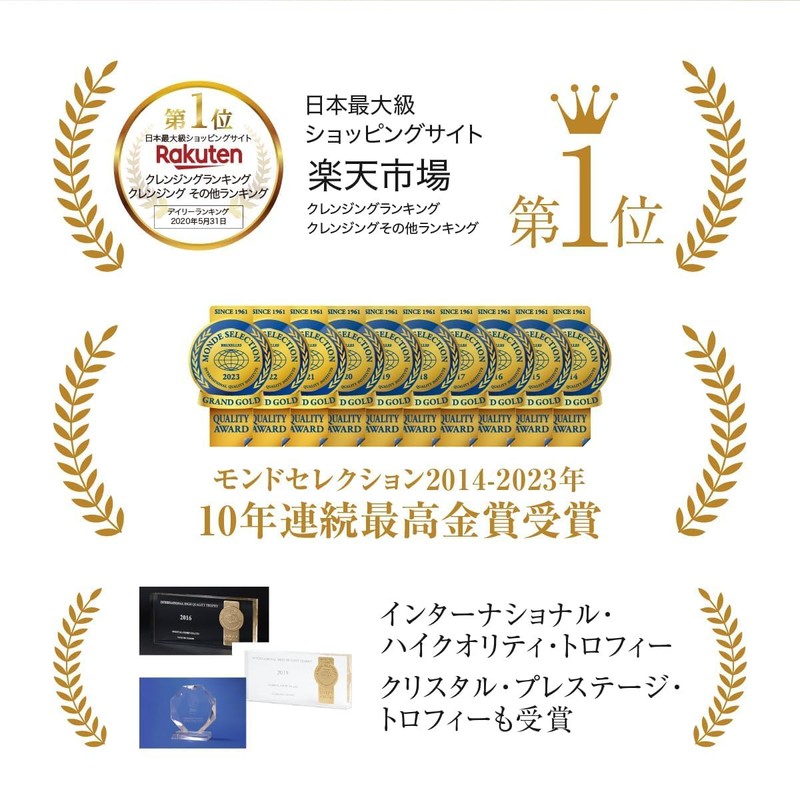 - Monde Selection 10 Consecutive Best Gold Award (2014 to 2023)), "Rakuten Market Daily Ranking Award! Cleansing ranking / cleansing etc. No. 1 (May 31, 2020)