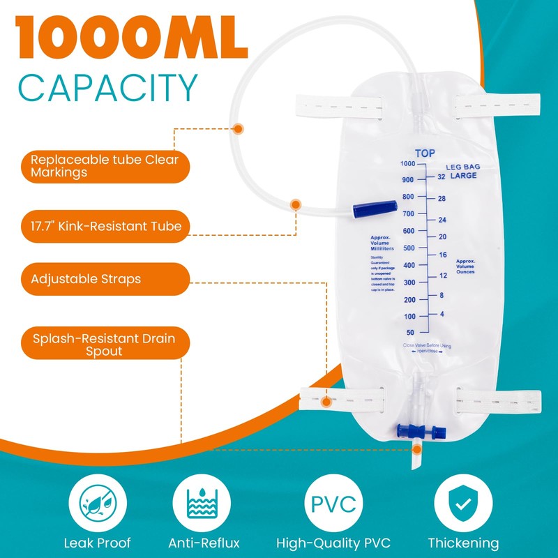- 1000 milliliters of sterile urine is drained into the leg bag. Each urine leg bag is sealed separately and airtightly, and is for single use only to ensure hygiene. If the packaging is damaged, do not use it.