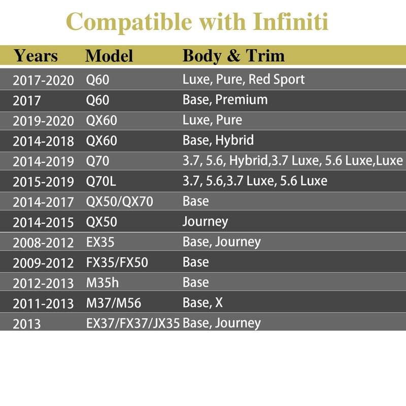 - 【Compatible with Infiniti】:2017-2020 Q60;2014-2020 QX60;2014-2019 Q70;2015-2019 Q70L;2014-2017 QX50;2014-2017 QX70;2013 EX37/FX37/JX35;2009-2013 FX50;2012-2013 M35h;2011-2013 M37;2011-2013 M56;2008-2012 EX35;2009-2012 FX35