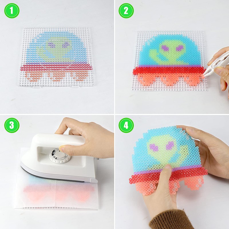 2. Put the ironing paper on beads and heated by the iron until the beads stick together. (NOTE: To fuse the design, an iron is required. The iron is not included in the package.)