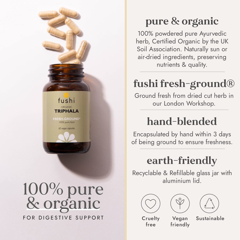 - Fushi Triphala is Organic Certified by the Soil Association and is sustainably sourced direct from growers and is 100% pure - only one ingredient - no fillers, binders, preservatives or bulking agents and is certified vegan & cruelty free.