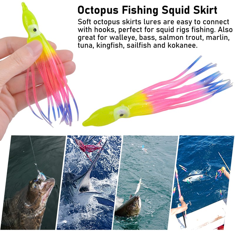 - 【WIDE TARGET SPECIES】Soft octopus skirts lures are easy to connect with hooks, suitable for saltwater mostly, widely targeting predator fishes such as striped bass, king salmon, tuna, mackerel, groupers and etc.