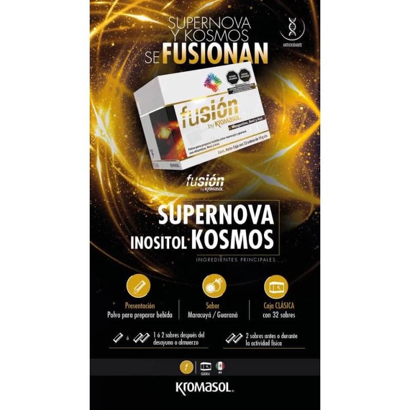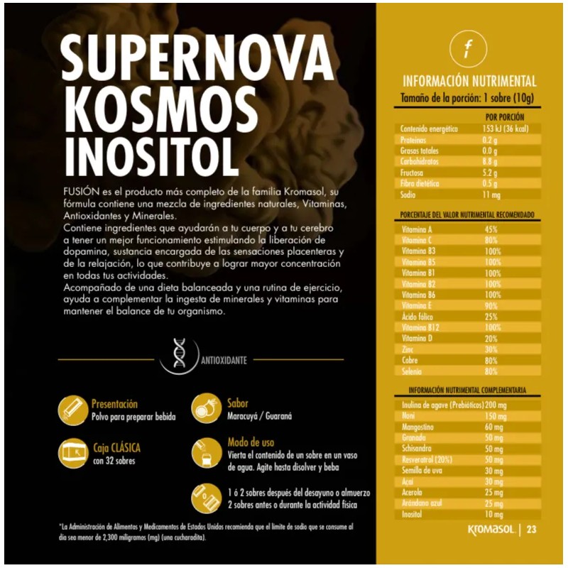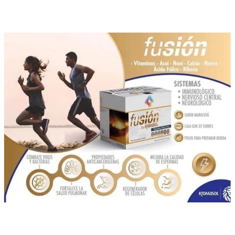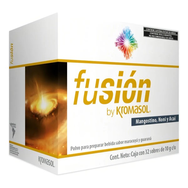 Fusión es el producto más completo de la familia Kromasol. Su fórmula innovadora combina vitaminas, minerales, antioxidantes y extractos naturales (noni, mangostán, granada, schisandra, resveratrol, uva, acai, acerola, arándano), junto con prebióticos (inulina) e inositol, para ofrecer: