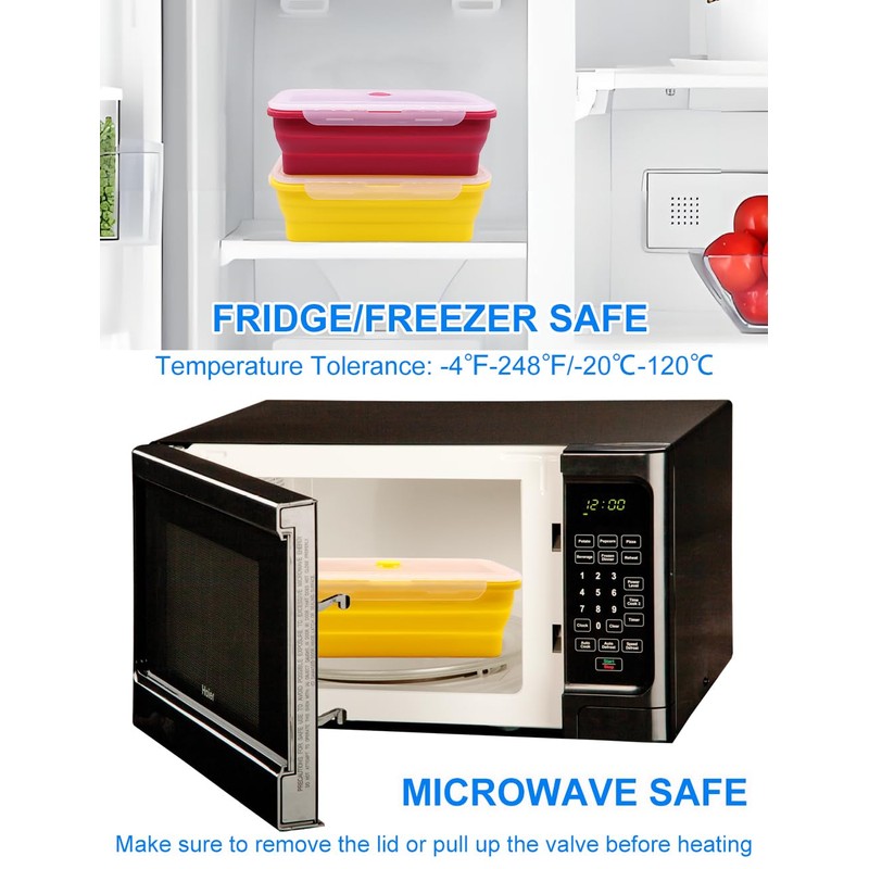 FUSMYE Silicone containers are 100% BPA and BPS-free, so it’s safe for you and your family. They’re microwave, dishwasher, and fridge/freezer safe making leftovers and cleanup a breeze. The top valve can be closed to seal contents inside the containers or opened to vent air out as well. This keeps food fresher for longer and is great for use in the microwave.