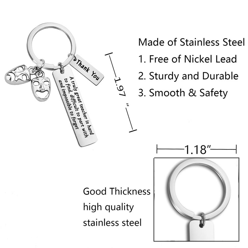 - MATERIAL&SIZE: This Theatre Teacher Keychain is crafted of high polish stainless steel. As it is hypoallergenic, no harm to health and very durable suitable for treasure. Keychain Bar pendant length 1.97*0.47inches width; keyring diameter: 1.18inches.