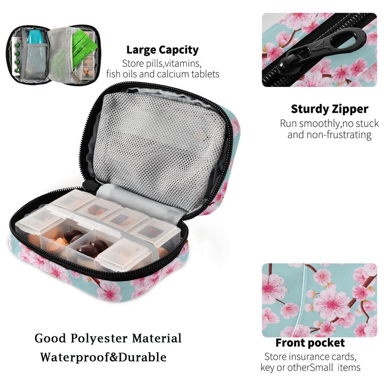 Fustylead Fustylead Pink Cherry Flower Pill Organizer Travel Portable Zipper Cloth Bag for Holding Weekly Supplements Vitamins and Fish Oils