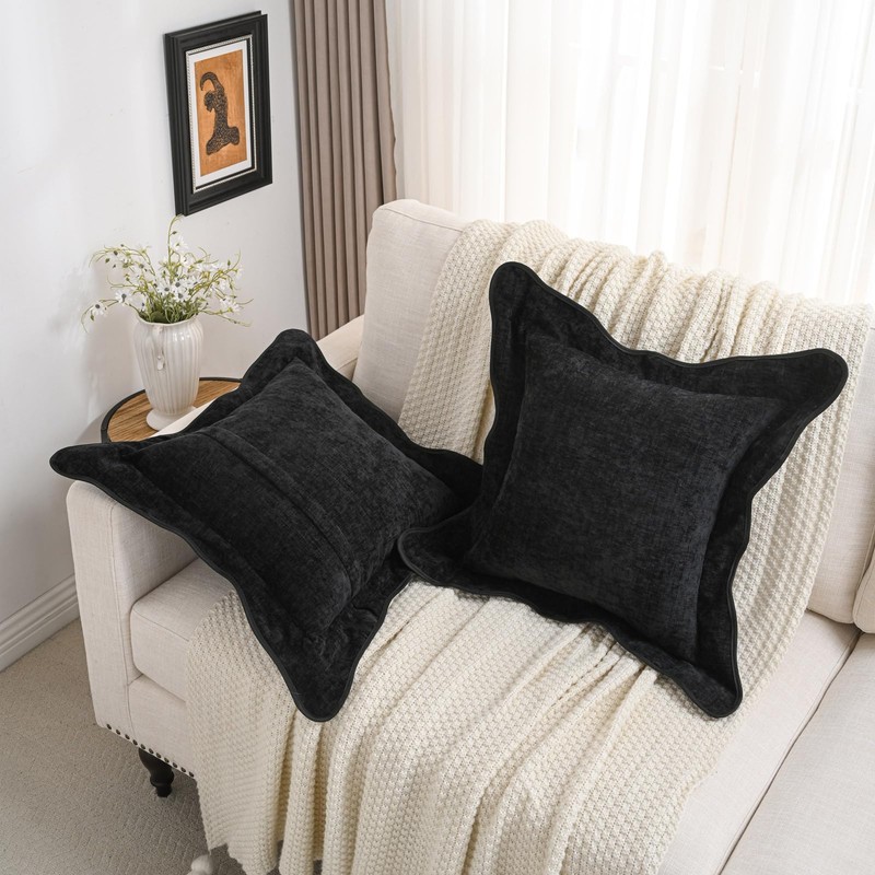 FUTEI Black Chenille Throw Pillow Covers 18x18 Inch Set of 2,Double Stitch Scalloped Bordered Soft Square Cushion Case,Home Decor for Couch,Bed,Living Room