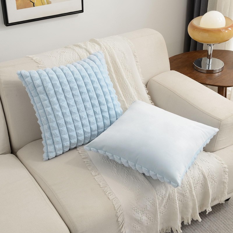 FUTEI Light Blue Decorative Throw Pillow Covers 18x18 Inch Set of 2,Square Cushion Case,Fluffy Faux Rabbit Fur Plaid & Soft Velvet Back,Modern Home Decor for Couch Bed