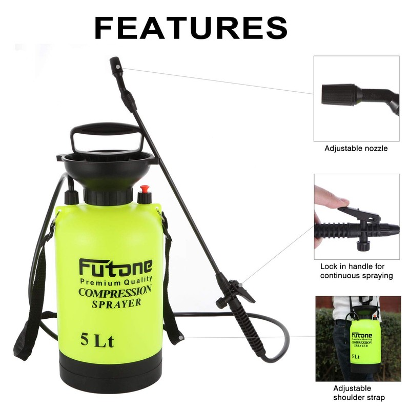 - SAFE AND DURABLE: The Futone garden sprayer has a highly efficient design with a sturdy and non-corrosive built that will serve you for years to come. The pressure relief protection valve automatically vents pressure to eliminate risk of bursting.