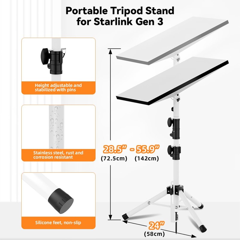 - Starlink tripod mount constructed of durable stainless steel for reliable strength, rust and corrosion resistance; 60 lb maximum weight capacity; easily adjustable to meet varying height requirements up to 53 inches and adjustable angle with removable tube adapter, compact storage design for easy portability