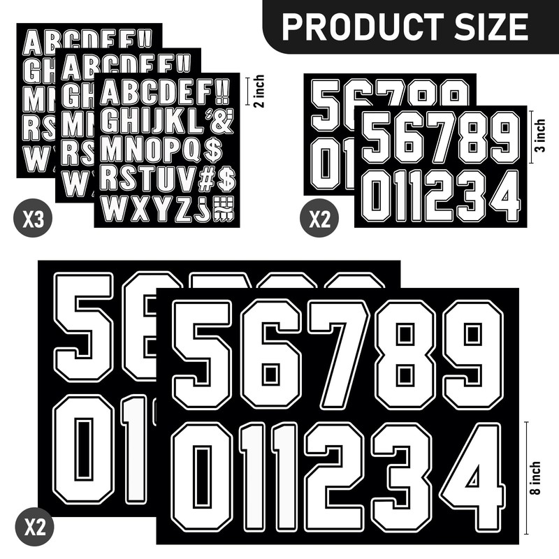 - Package Content: you will receive 190 pieces of fabric stickers for clothing, including 3 sheets of 2 inches letter stickers (45 letters each), 2 sheets of 8 inches number stickers (11 numbers each), and 2 sheets of 3 inches number stickers (11 numbers each), sufficient for your daily use and replacement; The typesetting received is different, you can cut it individually without affecting normal use