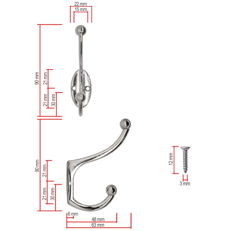 - Technical data: dimensions 95 x 52 x 63 mm, screws 12 x 3 mm, hole spacing 30 mm, box contents: 5 hooks, 10 screws
