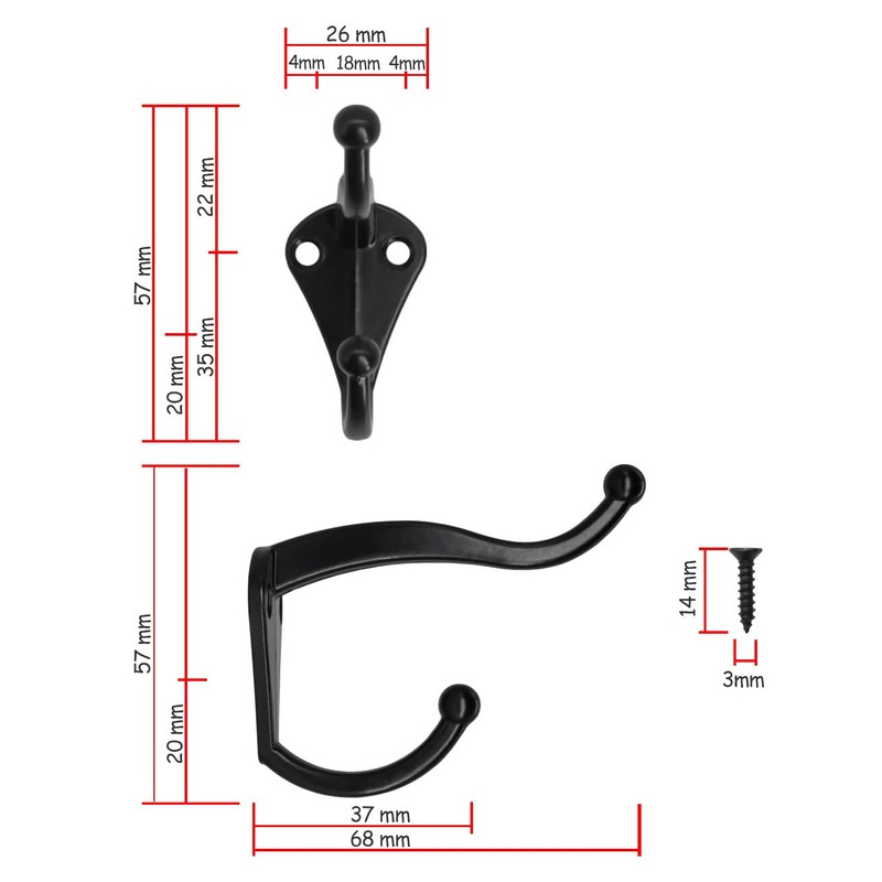 - Technical data: Dimensions: approx. 5.7cm high, 2.6cm wide, 6.8cm long; Hole spacing: 12mm; Package Content: 6 hooks with screws.