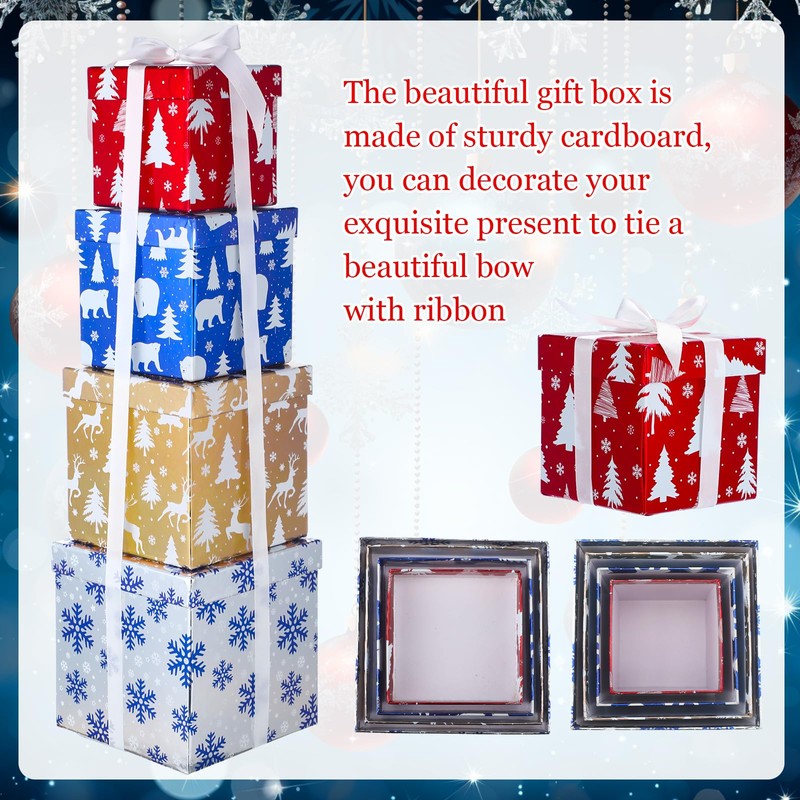 • Package Set: each purchase includes 4 square Christmas nesting boxes for gift and a roll of ribbon; This complete set ensures all your gifting needs are satisfied, making it the suitable choice for this festive atmosphere