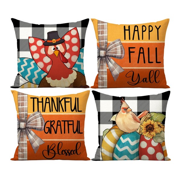 FUYUCHEN Happy Fall Thanksgiving Pillow Covers 18x18 Inch Turkey Cardinal Pumpkins Buffalo Plaid Throw Pillow Cases for Thankful Harvest Holiday Farmhouse Decorations Sofa Couch Set of 4