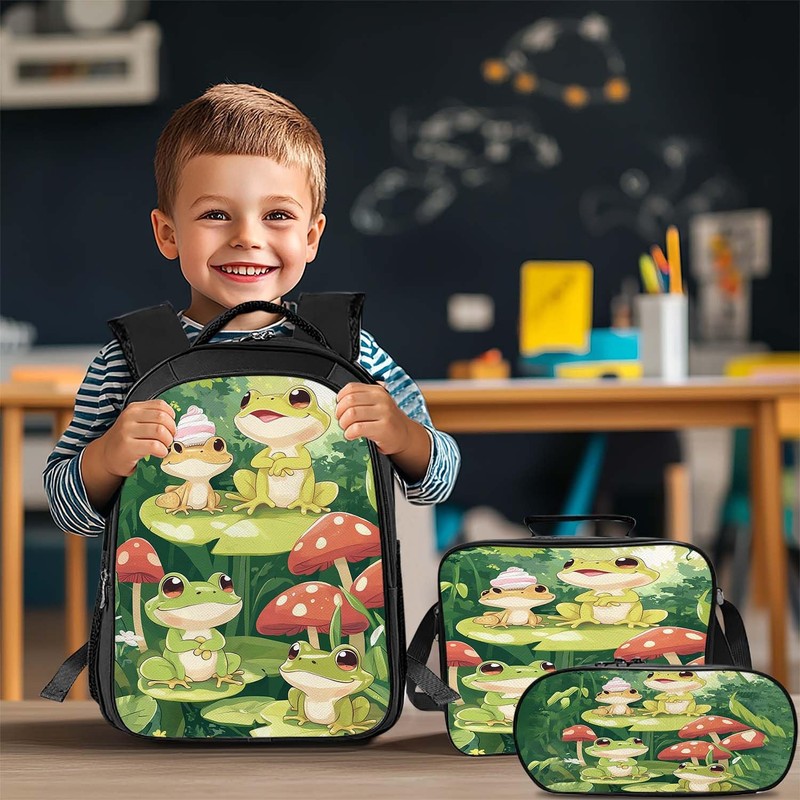 Fuzawet Cute Frog Backpack 3PCS 16" Preschool Elementary Schoolbag with Lunch Box Pencil Case Bookbag Set for Girls Boys Kids Children Teens School Students