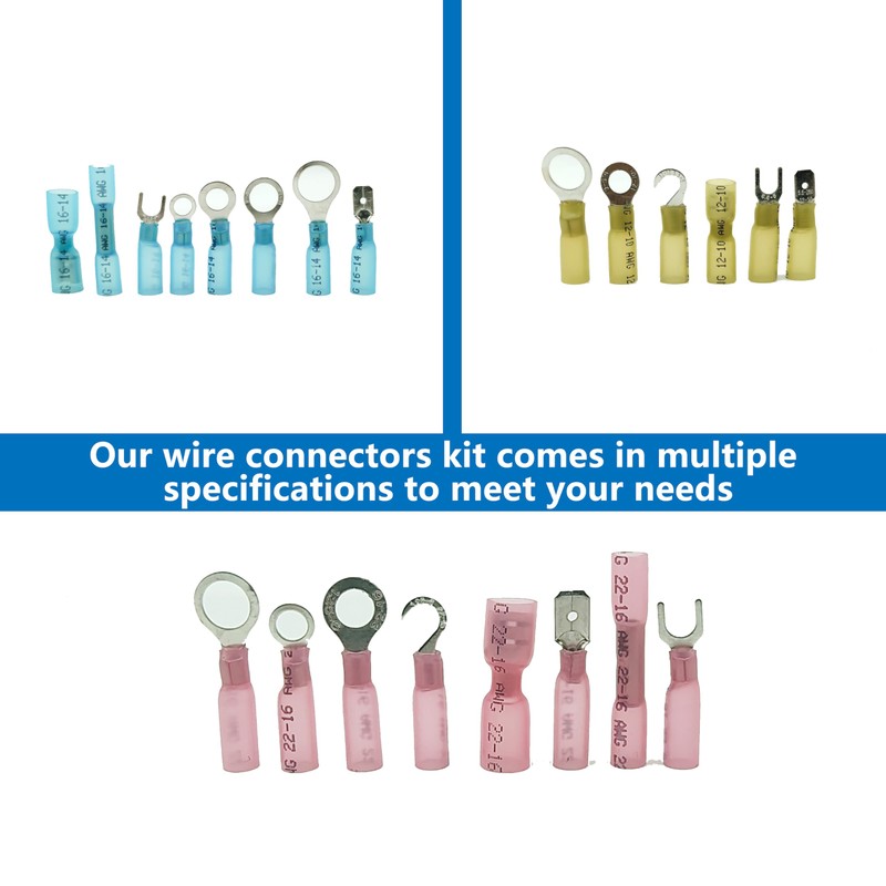 - Heat Shrink Wire Connectors: Featuring adhesive-lined polyolefin tubing, the heat shrink tubes seal all the way to the end of the barrel, making these electrical connectors suitable for outside or inside vehicle use to perform good water proof. protect your connections from moisture and corrosion