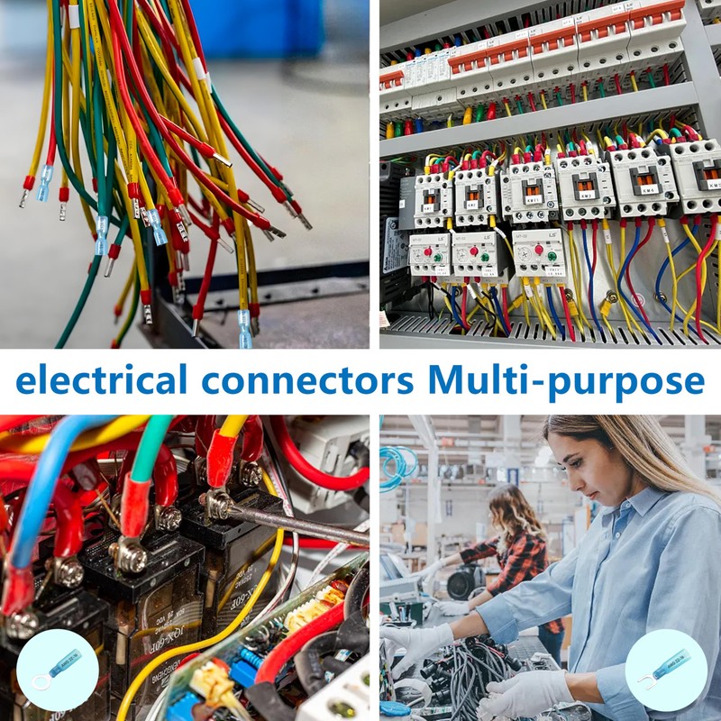 - Wire Connectors Kit: Our 270Pcs electrical connectors kit comes with a variety of commonly used types such as ring, fork, hooks,spade, and heat shrink butt connectors to meet your wiring needs,Wire connectors kit includes AWG16-14 22-18 12-10 3 types gauge, rings(10,1/4,5/16,3/8),3 colors distinguish,They can be easily identified by different color-coded tubes with wire gauge markings, which making work more accessible
