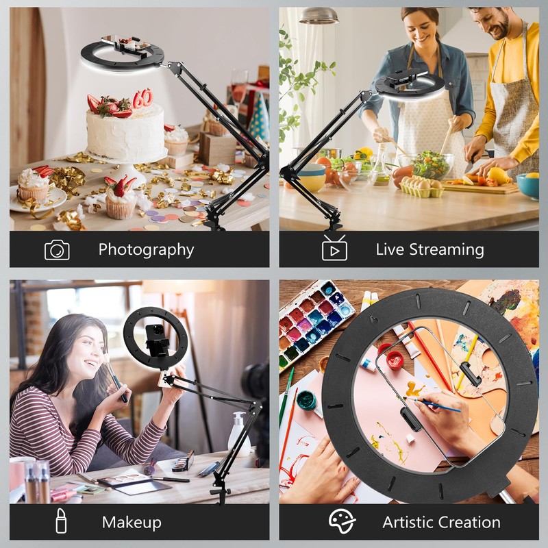 • 【1s Completion Angle Adjustment】The ring light for desk can meet any angle you need. The ring light is connected to an arm. When you need to change the angle, just pull the ring light with stand directly to the angle and distance you need. It only takes 1s to complete. Perfect for the shooting of cooking,painting,art,nails and crafts.