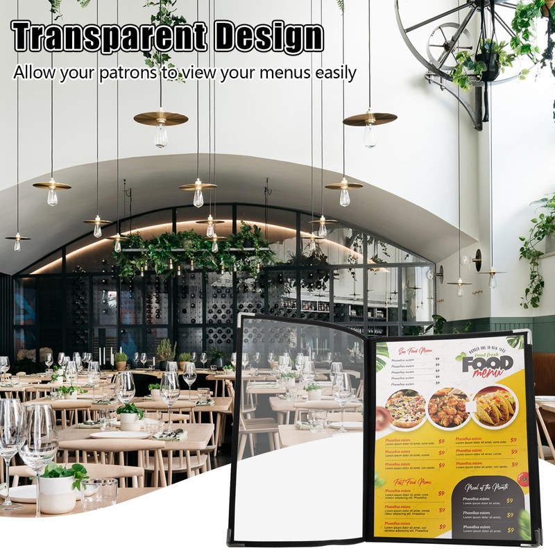 - Premium Material: Clear restaurant menu holder is made of quality flexible PVC, non-shattering, durable, vinyl material makes it easy to clean and protects your menu in the event of spills. Transparent design allows your patrons to view your menus easily